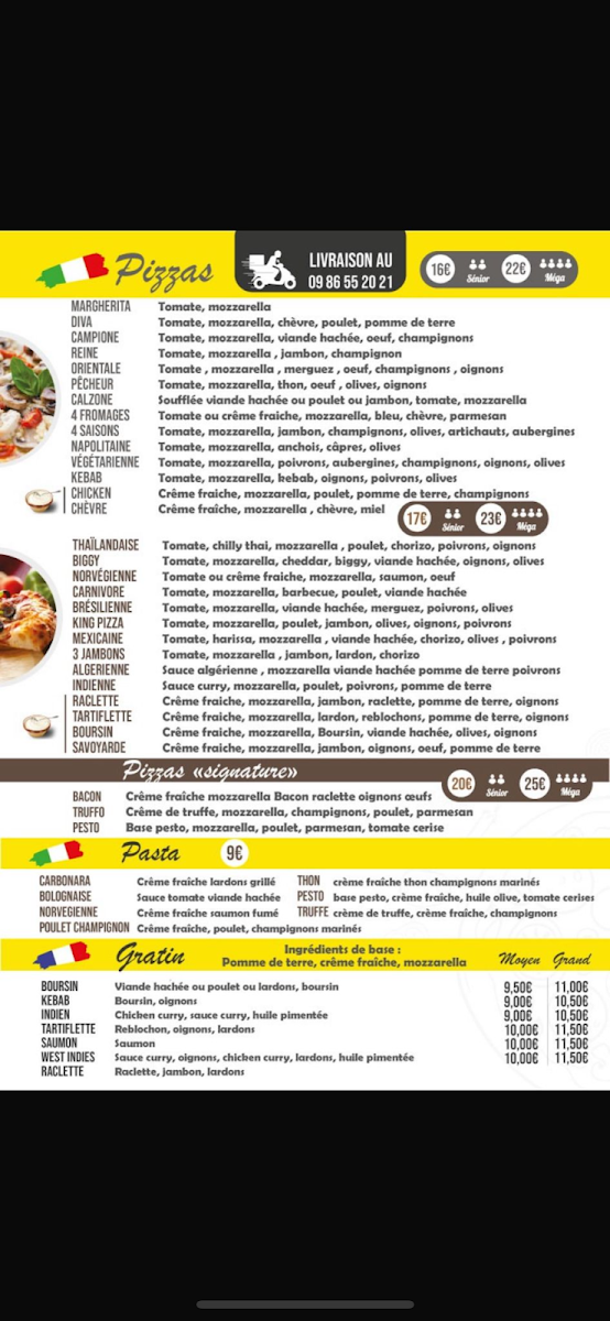 The menu offers a variety of pizzas designed for delivery, takeaway, or dining at the restaurant. It features several pizza options categorized primarily by their toppings and ingredients.