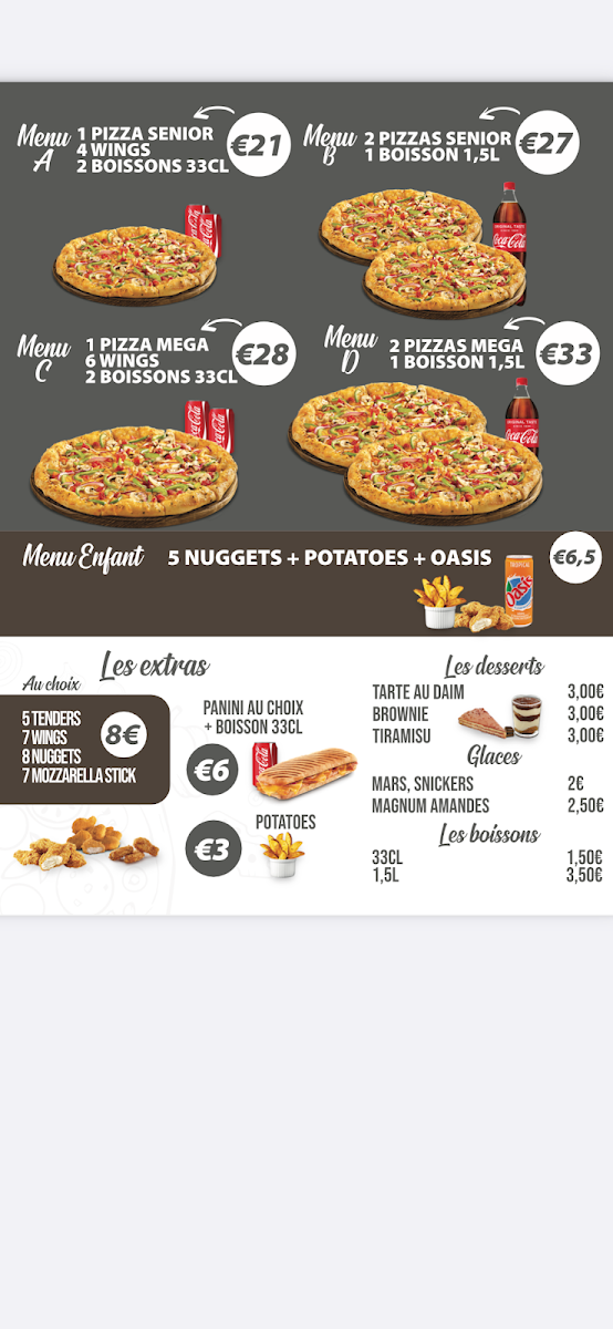 Les Pizzas: This section includes pizzas with tomato sauce or crème fraîche bases combined with mozzarella and a variety of toppings such as seafood, meats, vegetables, and cheese. Examples include the Pizza Pêcheur with tuna and egg, Pizza 4 Saisons with ham and vegetables, Pizza Orientale featuring merguez sausage, and vegetarian options with assorted vegetables and olives.